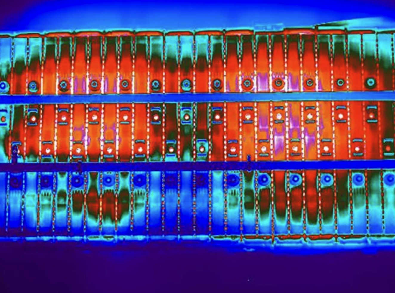 Lithium-ion electric vehicle batteries monitored under thermal imaging.